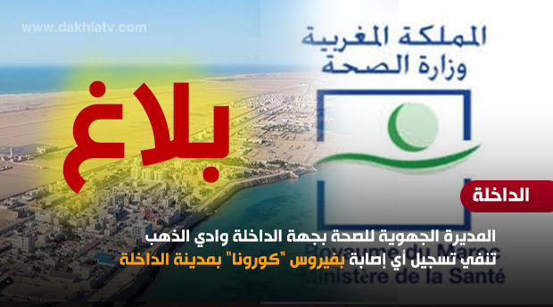 وطمأنت المديرة الجهوية للصحة بجهة الداخلة وادي الذهب، المواطنين، أنه ولحدود اليوم، لم تُسجل أي حالة إصابة بفيروس كورونا المستجد بمدينة الداخلة، وأنه تم اتخاذ كافة التدابير والإجراءات الاحترازية اللازمة، كما تم تفعيل نظام المراقبة الصحية على مستوى مطار وميناء الداخلة، والمعبر الحدودي “الكركرات”، وذلك من أجل الكشف المبكر عن أي حالة واردة والحد من انتشار الفيروس ببلادنا، والتكفل بها طبقا للمساطر العلمية والطبية المعمول بها على مستوى الوزارة.