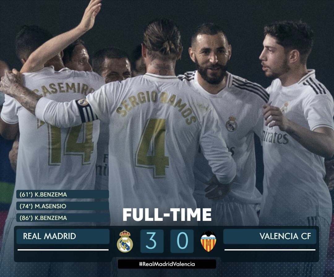 وسجل أهداف الفوز كل من “كريم بنزيما” ثنائية في الدقيقتين 61 و86، و”ماركو أسينسيو” بالدقيقة 74.