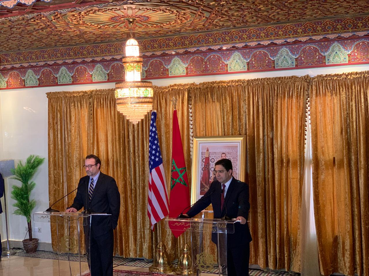 عقد صباح اليوم بمدينة الداخلة كل من وزير الداخلية المغربي السيد ناصر بوريطة و مساعد وزير الخارجية الأمريكي بالشرق الأوسط وشمال أفريقيا ديڤيد شينكر مؤتمرا صحفيا قبل زيارة مقر القنصلية الأمريكية العامة بالداخلة.