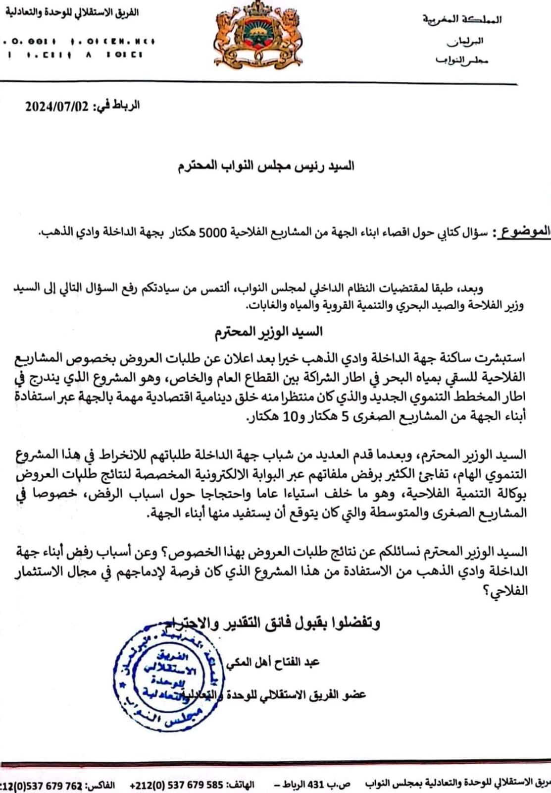 وهذا نص السؤال الكتابي الذي وجهه النائب البرلماني عبد الفتاح اهل المكي: